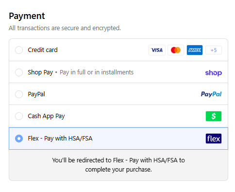 You'll see that as a payment option at checkout. Please note, that you must check out as a guest to use Flex and this is only available on one-time purchases, not subscriptions. And to use, you must select Flex as the payment method in checkout—which will redirect you to their site for secure checkout.