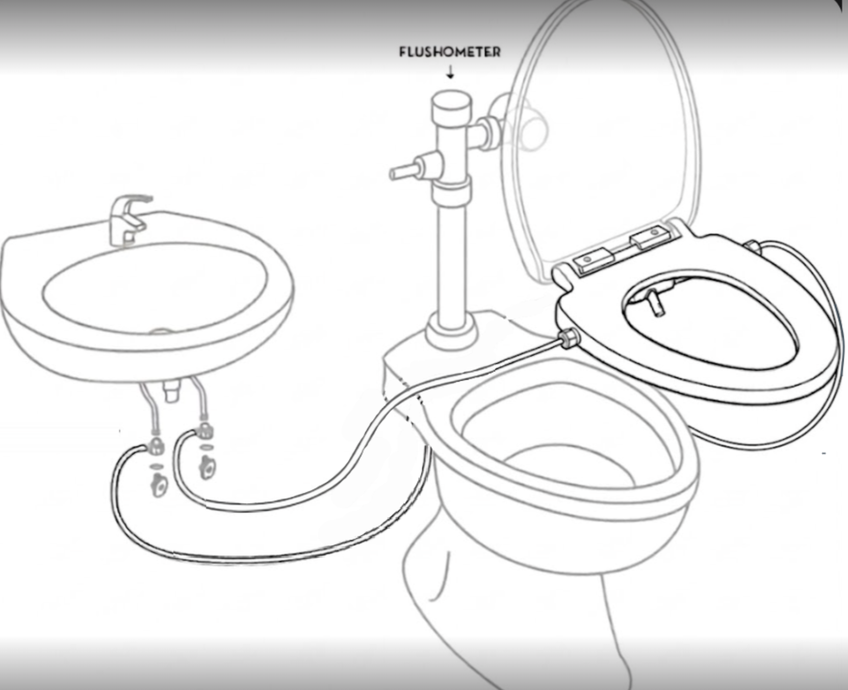 If your toilet’s angle valve/water connection isn’t accessible—or if you have a Flushometer or a wall-mounted toilet—don’t worry! You can simply connect your TUSHY Wave to your sink’s plumbing, as long as it’s within 9 feet of the toilet. See the diagram below for an example setup: