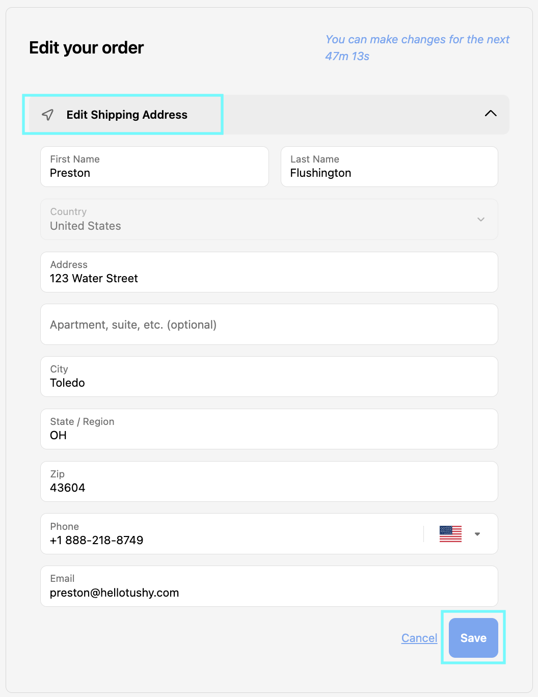 You now have 60 minutes after placing your order to make changes or cancel. Just click the “View your order” button in your confirmation email to update your info on your own.